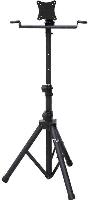 I use a tiltable versa bracket I bought from Walmart 4+ years ago and attached it to a foldable tripod mic stand too. I put a piece of gaff tape (heavy duct tape) over the leg (as shown). I have never had anyone knock it over, or trip over it because it is so low profile. It folds up flat to about the size of a child's snow shovel, and I put it screen down on the floor of my car trunk with a rug on top of it. Then I load everything on top of it! Over 4 years now same stand, same monitor.