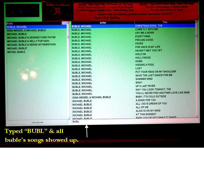 You guy's got quite impressive kiosks. I have yet to attain that level of tech knowledge. ‘still learning but hopefully soon. Right now I’m still basic, using Graham’s karaoke kiosk. http://www.grahamskaraokesystem.com/products.html one time fee of $19.95, no expiration date. Find the song, fill out request slip & bring it to me so I can interact with them, small talk or just to say hi! (11 karaoke books available - side cabinet). Load songs from c:\ or external drive folder. Updating, loading additional new songs is a breeze; takes less than a minute Interactive typing – type two or three letters & it will start searching, showing back the result as you go along for those letters typed without pressing ‘enter’. Type 4 letters i.e.,“BUBL” it will show all buble’s song. No internet connection. Optional: complete package: dj + karaoke hosting platform software & song request via smart phone - $99, no exp date. (not for me, tho’, also I'm not affiliated with this company in any way, shape or form). I also subscribe to Songbookslive.com, ($19 a yr) for their phones. Attachment:
