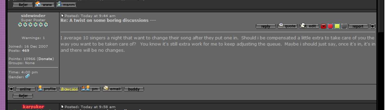Posted: Today at 9:44 am Re: A twist on some boring discussions --- -------------------------------------------------------------------------------- I average 10 singers a night that want to change their song after they put one in. Should i be compensated a little extra to take care of you the way you want to be taken care of? You know it's still extra work for me to keep adjusting the queue. Maybe i should just say, once it's in, it's in and there will be no changes.