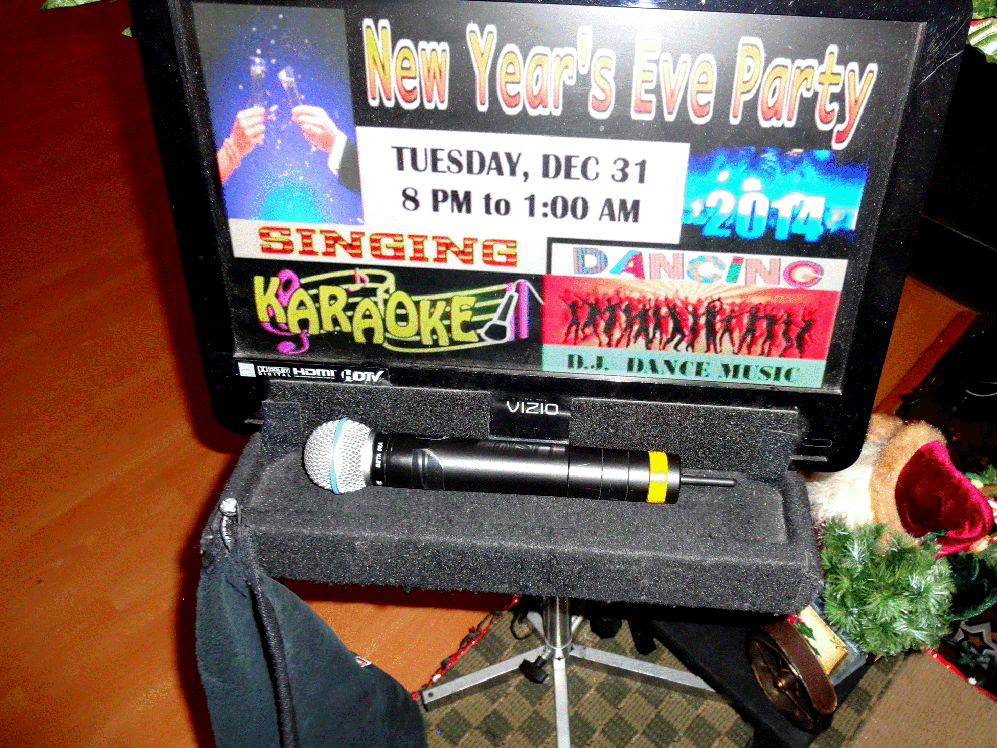 I also have one of those tv stands with the mic holders on each side. You would think that sliding a mic into a holder would be child's play, right? Nope. What a pain that turned out to be the first year I used it. People constantly dropping my mics trying to put them in those holders or just couldn't figure it out at all.