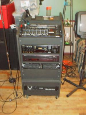 My basement "Studio" . Not much of a STUDIO per se. But its enough to let me make passable recordings for SINGERS SHOWCASE or THATS KARAOKE. You may have clicked in and heard them. JVC SV22 hooked into laptop or home puter. Then into home entertainment system. Plays PLENTY loud for home Karaoke parties--have had MANY! Klipcsh speakers. DBX 3BXII, Pioneer RCVER. Photos on wall are of blues shows I've shot. From Left top corner: Taj Mahal, Steve Miller, Bernard Purdie, Pinetop Perkins, Roseanne Cash, Curtis Salgado, Jodie Wiliams, Roy Clark either by themselves or with me. Big Collage is form 2003 Portland Waterfront BLues Festival. Newpaper article shown is story and pics I wrote and shot on the BLues Festival.[/img]