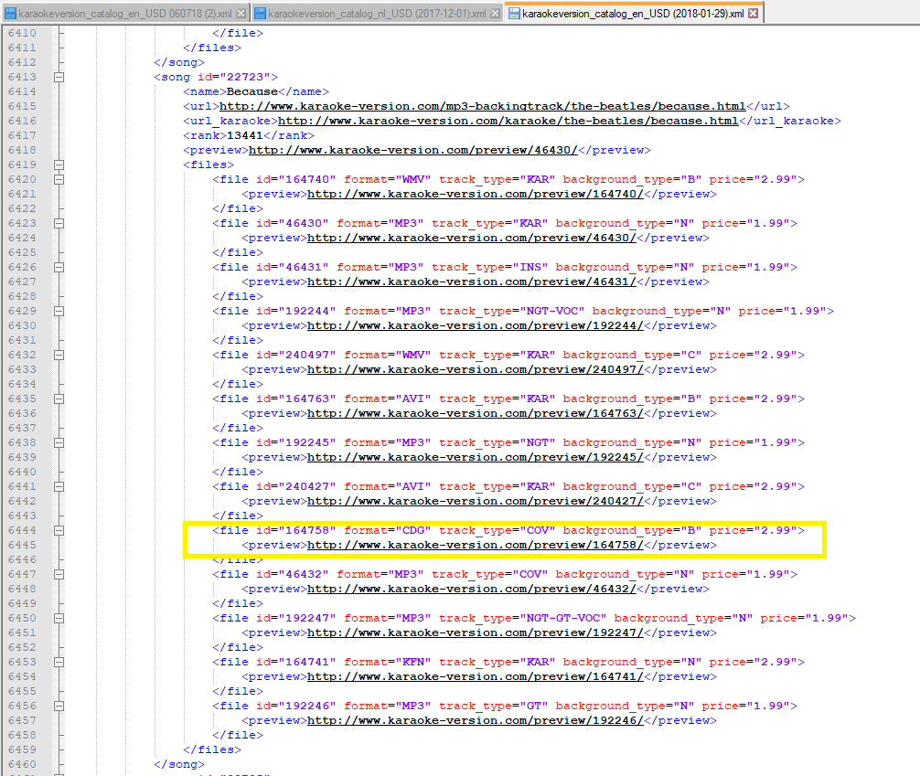 For those that are interested... here is a snapshot of one song from KV and all of the files they sell related to that song... each sellable item has a DIFFERENT number to it (like a barcode on a product purchased at a store). The product number is the same on that item regardless of who purchases it. In the KV catalog picture, I have placed a yellow box around the CDG Item for the song. THAT number is the number at the end of the song when purchasing the karaoke track. The files inside the zip may have a different number than the one on the outside of the zip. I believe the internal number reflects the "songid" (see upper left corner of picture) or folder number used by the production team to identify the administration folder that groups all of the production materials for that song. If you buy just a backing track you will get a file with the number representing the product number for that track (mp3/kar, mp3/ins, or mp3/ntg-voc) depending on if you purchased the original backing track (with background vocals), the instrumental backing track, or the Cover backing track... the other "kar" files are the video files in various formats (mp4, WMV, KVN) and whether you chose color or black background. And of course the first "<preview>" number is what plays when you watch the sample track on the site. Attachment: