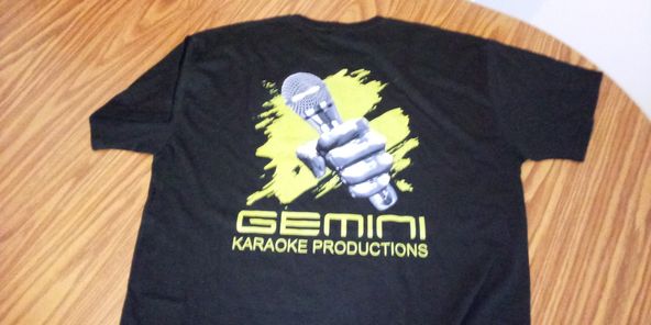 GK Productions wrote: The logo Alan B created for Gemini Karaoke has now found it place on tshirts left chest and full back...and yes its neon green logo but you cant tell from this pic very nice looks great!