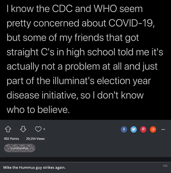 Alan B wrote: Here's a tip: There is so much misinformation, lies, and conspiracy theories circulating on line. Anything you read on any of the social media platforms, such as Facebook, is 99% false. It's not a very good place to get your information from. So, don't trust or believe anything from these type of platforms. but....but....but.....this chiropractor online said all the scientists, doctors, and virologists are wrong... Attachment: