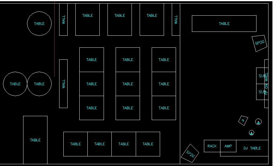 Well, I've been here about 8 times and set up different every time. Not found the sweet spot yet. I've done the subs under the tv most times and that does work best. I've generall been on the bottom rh corner(I'm stuck in the open spot for sure)....where to put the singers is the puzzling part. (I like about what you have, but I fear as we get busier we have to leave that huge table on the top, I had made that part the stage and worked out ok......but it's hard to clear out to set-up, people want to sit there...so that pushes me in a weird spot) They HATE their backs to the auidence, which I understand w/o using the 2nd smaller tv. The two upper walls and the middle wall are full up with booths not tables inbetween (not moveable). The line between the open space and the tables actually in a wall coming down from the celing it's about 7' high the full width. As far as wattage goes, I'm sending the subs 500 (too little) and the sp2g's 450 (when I use all 4) I had the subs bridged and sending them 1400(too much), but ok...but I unbridged to use other channel for a monitor speaker, but can go back. Thanks for looking Ollie, I've been trying different stuff and thinking of every option..just looking for more! MrD