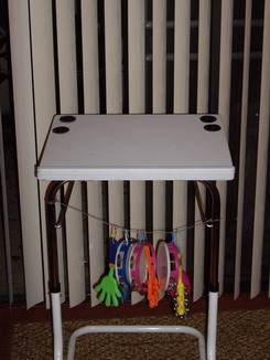 I constructed (rebuilt) this from a snack table. Please note that the unit is accommodating four of my wireless mics. The holes for the mics are lined with the plastic tubing from spools of wrapping ribbon (it required two spools). The most important part of the redesign was to rotate the table top 180 degrees (front to back) so that the table would not easily tilt over and also so it would angle the TV properly (about 15 degrees). The unit is sturdy, lightweight, compact (the top can be folded down or removed) and easily transportable. And it works perfectly for wireless mics. I also have a mic stand that I use for wired mics. It has a stereo top, but I often add a clip-on gooseneck holder so it can hold a total of 3 mics. I never use that stand for wireless units!!