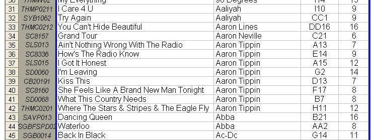 I am digital and do not list cd's or track numbers in my books All I need is your name and title or artist and will have it in seconds. Why anybody wants to keep in the cd format is beyond me. It is archaic and requires your singers to provide a number when it is not necessary.
