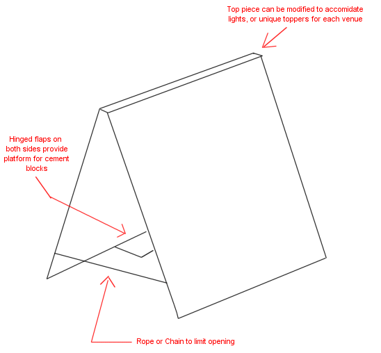 Cheese,,yep, that would work too. Same thing tho, to have to carry around the ballast for weight too. The pro's to my sign is, the sign wording can be changed at will. The fronts have screens and frames that swing up to change the signs. I agree, it's kind of heavy, but I can handle it myself with no problems. It will fit in the back of my truck easily. One other thing I am working on is a banner to hang on the front of the trailer itself, advertising "Karaoke Tonight!". Simple as that. I would take it down after each show.