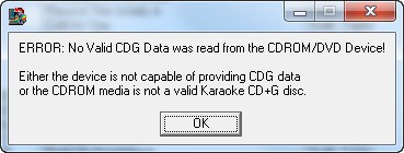 I can rip it to a zip file (cdg + mp3), and it will play the audio but no graphics. Graphics don't show up. Tried it with Power CD+G burner and CDG Rip. I have no clue why. This is the new one called Speak Now. And this is the error message that CDG Rip gave me. Even Karafun won't show the graphics. Will play the music but just a blank screen where the lyrics should be.
