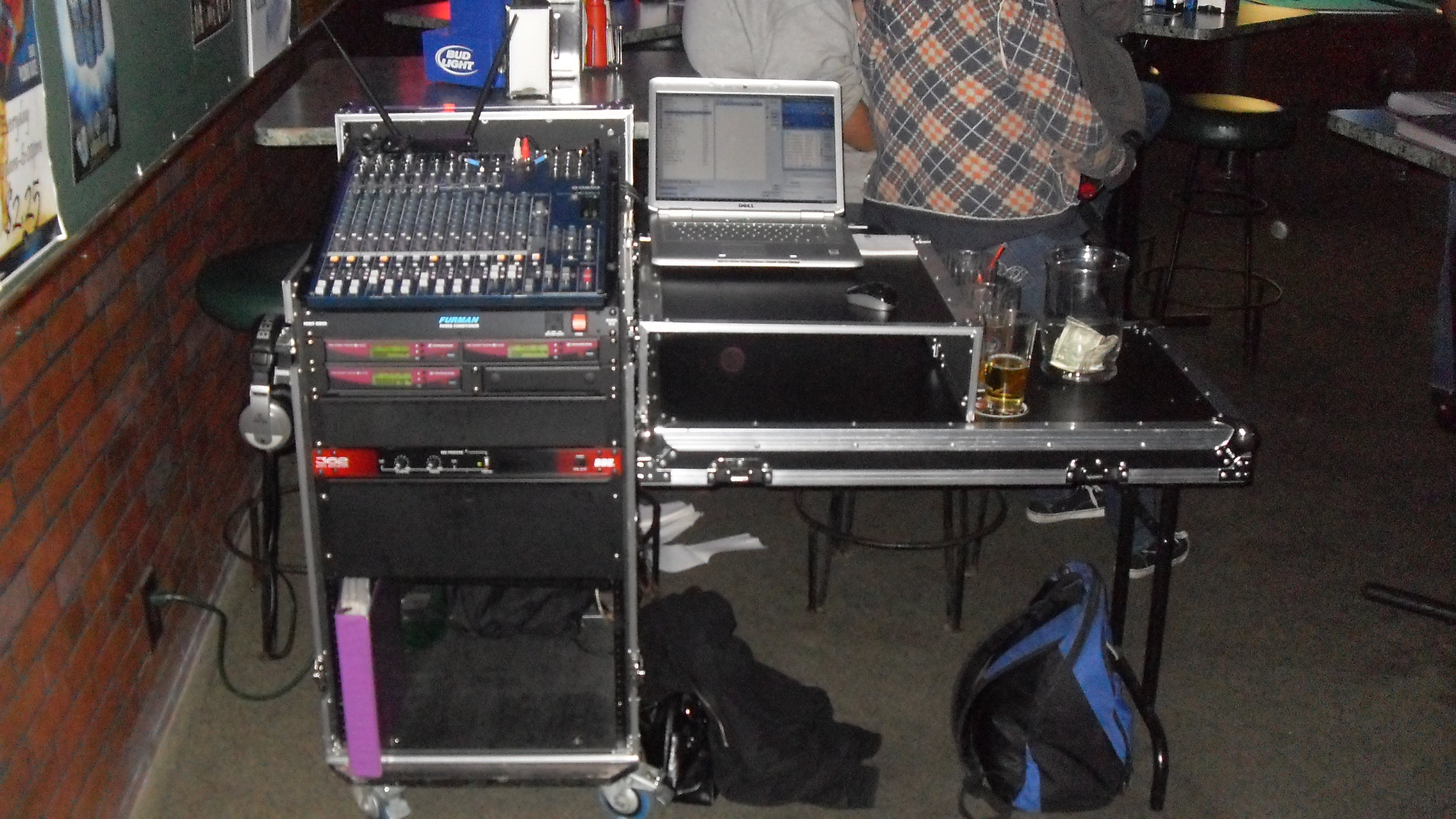 everything i have is mounted in a 16sp rack on wheels. the front cover turns into a table. everything plugged into a power conditioner and the main cord replaced with a 40' extension cord hard wired inside the conditioner. one 2sp drawer for the mics with cut foam spaces, a 4sp drawer for the box of slips and pens, plus the laptop. books set on the bottom like a bookshelf along with the noismakers for birthdays, and tip jar. all internal cables made to size, laptop only needs power, 1 usb (from a hub with hard drive cable, sound card cable and mouse reciever) and HDMI (to a converter to wireless video sender) all 3 of which are tied together in a "snake" of sorts. boards main out goes to x2 wireless. Bose and 2 subs set up, cables for subs are cut to size, power and 9v adapter (for wireless reciever) tied together. video reciever stays mounted behind the bar plugged into the distro switcher. set up time, under 10 minutes to be playing music.