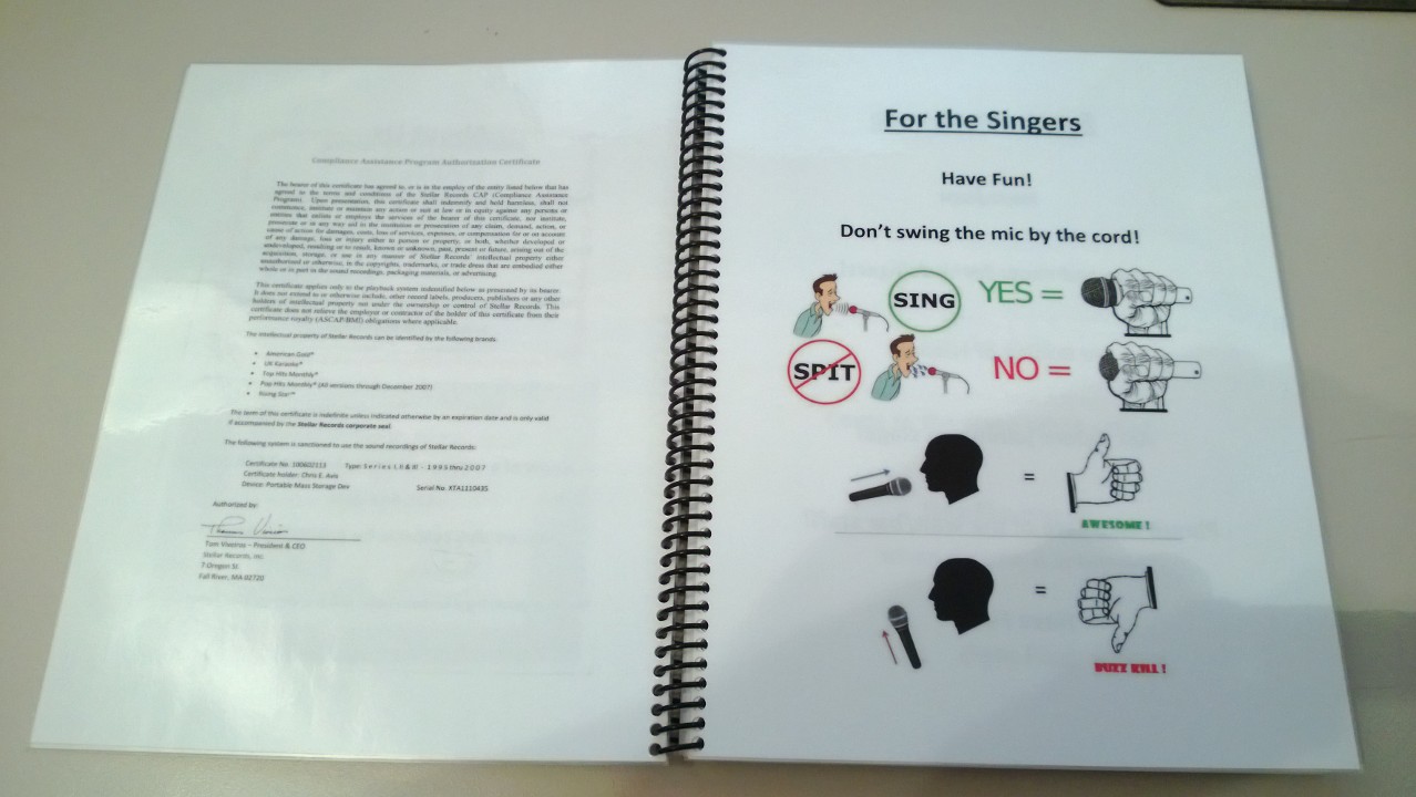I didn't want to hijack the other thread. I have never liked 3 ring binders. In the 20+ years of going to karaoke, I have never been to a show that used 3 ring binders where the binders were anything but beat up, clunky, sticky, pages missing, rings catch pages....the list goes on. In a word, 3-ring binders suck IMO (my apologies to everyone that uses them). I have always used spiral binding (pics). I started laminating the front and back covers after seeing Big Mike's books in Oregon. I now also laminate the first 3 additional pages that have other permanent info about the show. I am currently looking at some polyester papers that are water resistant/proof. Hose the entire book down as needed. First impressions mean everything. The books are one of the first things people encounter. A great looking book means a lot to me as a singer and I have received a lot of compliments on mine. I reprint books after I have hit a self-determined quantity of new updates to the library. I will also reprint if they get trashed regardless of how old they are. To offset costs, I am now working with local establishments to place ads in the books on permanent laminated pages. Pros - Very professional looking Smaller Books means less weight/space used Pages never get caught, fall out, replaced in the wrong order I can toss a book to someone without worrying about it flying apart Cons - Can't be easily updated Pages can still be torn out, stained Overall more expensive to print/update Attachment:
