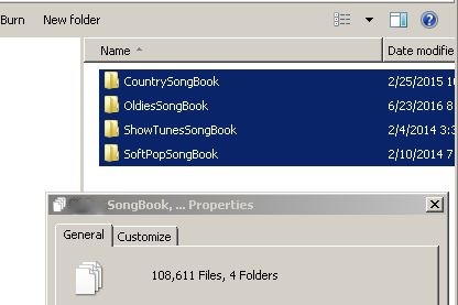 screamersusa wrote: Keeping 10-15k of karaokes in one directory is absolutely nuts!!!!!!!!!!! YES! I OWN THAT MANY PHYSICAL DISKS WORTH OF SONGS. I keep mine in 4 different folders so that I can create my songbooks by 4 different categories. I have all mine unzipped. By "Soft Pop" I mean no rap and no headbanger stuff. I actually have many more songs but they don't fit my style of hosting and my type of venue. Also some songs are in another folder called Special occasions>YES! I OWN THAT MANY PHYSICAL DISKS WORTH OF SONGS" and then some.