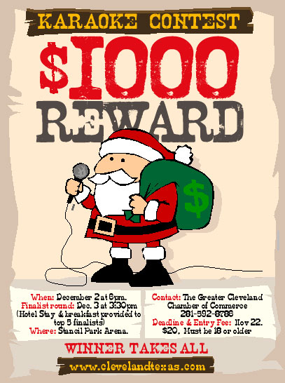 Sing for Santa! 5 Finalists win FREE overnight stay at Executive Inn and FREE brakfast at the Plantation Restaurant. Contest deadline: NOV 22nd. Entry Fee:$20. One Winner takes home $1,000. Check website for entry form, rules, and regulations. Good Luck! 281-592-8786 for more info.[/url]