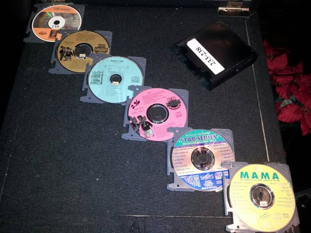 example of some disc cases....each contains over 320 cdgs, 5 seperate cases...3 english 1 spanish 1 foundations and bricks........these are just examples...inquiring minds want to know. Oh yeah as you can clearly see, all my cdg's are labeled and are sequenced in my books from DK001 to present... BTW this was taken by my cell phone tonight at my gig...fyi...although some may discredit me..... Timberlea i'msure you remember me from when you first started posting years ago, you were a newbie then, i already had alot of years on you by then......