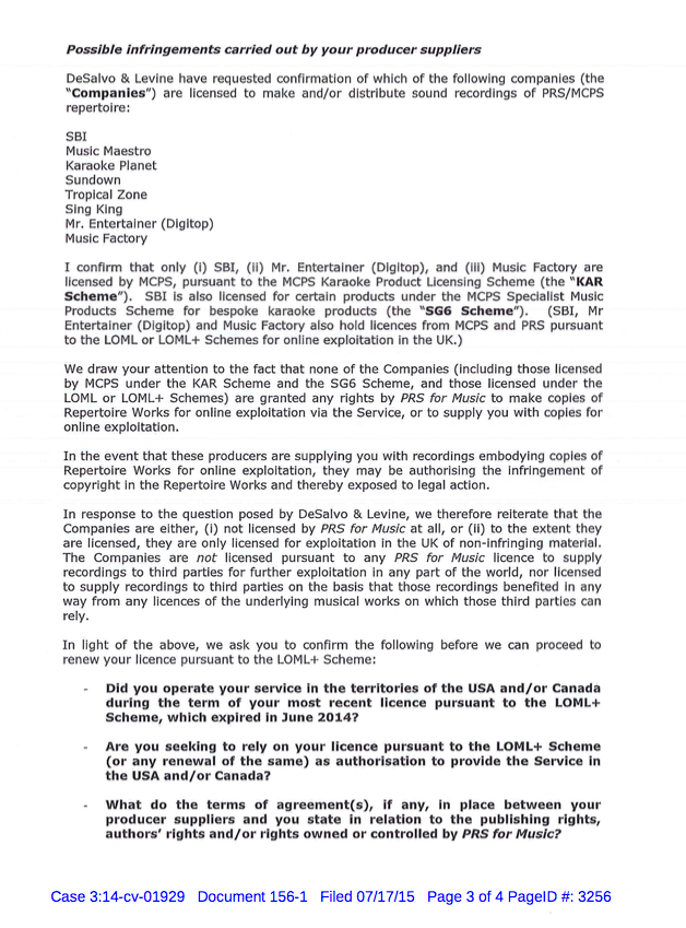 This really shouldn't be that much of a surprise to be fair. PRS licensing scheme makes production of content cheap and simple to do. But it is no different than any other with respect to territory. It seems like a popular misconception here that the sale of content by UK manufacturers is completely legal for anyone who wants to buy it regardless of where they live. This is absolutely not the case. In this attached letter which is publicly available from the ongoing suit between Sony/EMI and Tricerasoft, the PRS is explicitly clear that under no circumstance are UK licensees allowed to sell outside their territory. Zoom is no different than any of them in the UK...they won't do anything to hinder customers outside their approved territory unless they are actually forced to. It is what happened to Selectatrack and their motivation to partner with Tricerasoft in creating the Selectkaraoke "skin" of Tricerasoft and their being named in the ongoing suit as well. Attachment: