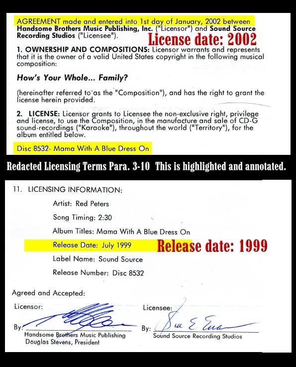 - License agreements generally run for 3-year terms You didn't actually read this one did you? It's not a 3-year term, it's for the length of the copyright. JimHarrington wrote: - The original production and release was in 1999 When Slep-Tone "released it" has no bearing at all on whether or not it was legally licensed at the time either. Quote: - This new license was issued in 2002 It's not a "new license" at all. It's the ONLY license. JimHarrington wrote: - There is no mention of retroactivity, of past royalties, or of any sort of claim, at least in the parts that are presented And there doesn't have to be. JimHarrington wrote: - This license agreement actually exists and post-dates the prior release Just because Slep-Tone was caught, and had a pre-suit settlement in addition to a license, doesn't in any way, shape, or form make the prior infringement go away. (Nice try though) JimHarrington wrote: - Red Peters has never sued SC He didn't need to. He had a pre-suit settlement. JimHarrington wrote: I do not know, and I have very little incentive to check, whether there was a prior agreement for this song. Even if I were inclined to check on the licensing status of a song from 17 years ago, not every karaoke license is an integrated agreement. We often go multiple years on a "handshake," or an email exchange, and formalize things when it's time to renew. There's a very simple reason for this: Negotiating licenses is expensive and time-consuming, especially on a song-by-song basis (and not all licenses are negotiated that way). If the more reasonable business choice is to discontinue the track, there's no reason to put together a formal agreement. It's not like the advances and royalties weren't paid. Of course you would have "very little incentive" to shoot yourself in the foot too. JimHarrington wrote: But what I do know is that this document is not "proof" of infringement. Much to the contrary, it's proof that at least during the term of this license, whatever sales we had were not infringing. Beyond that, it says absolutely nothing. It's just a convenient innuendo. Yes of course, "during the term of this license, whatever sales we had were not infringing" and that's not at issue here. You and I both know that during the term between 1999 and 2002 (when most of the sales would be made anyway) it was pure infringement/piracy. Unless of course counsel, you'd care to produce a license to cover that period because your "business on a handshake" never happened. JimHarrington wrote: Cue Mr. Staley, to try to rip apart my comments above. Let me know when you have some sort intelligible and credible comments, I'm all ears.