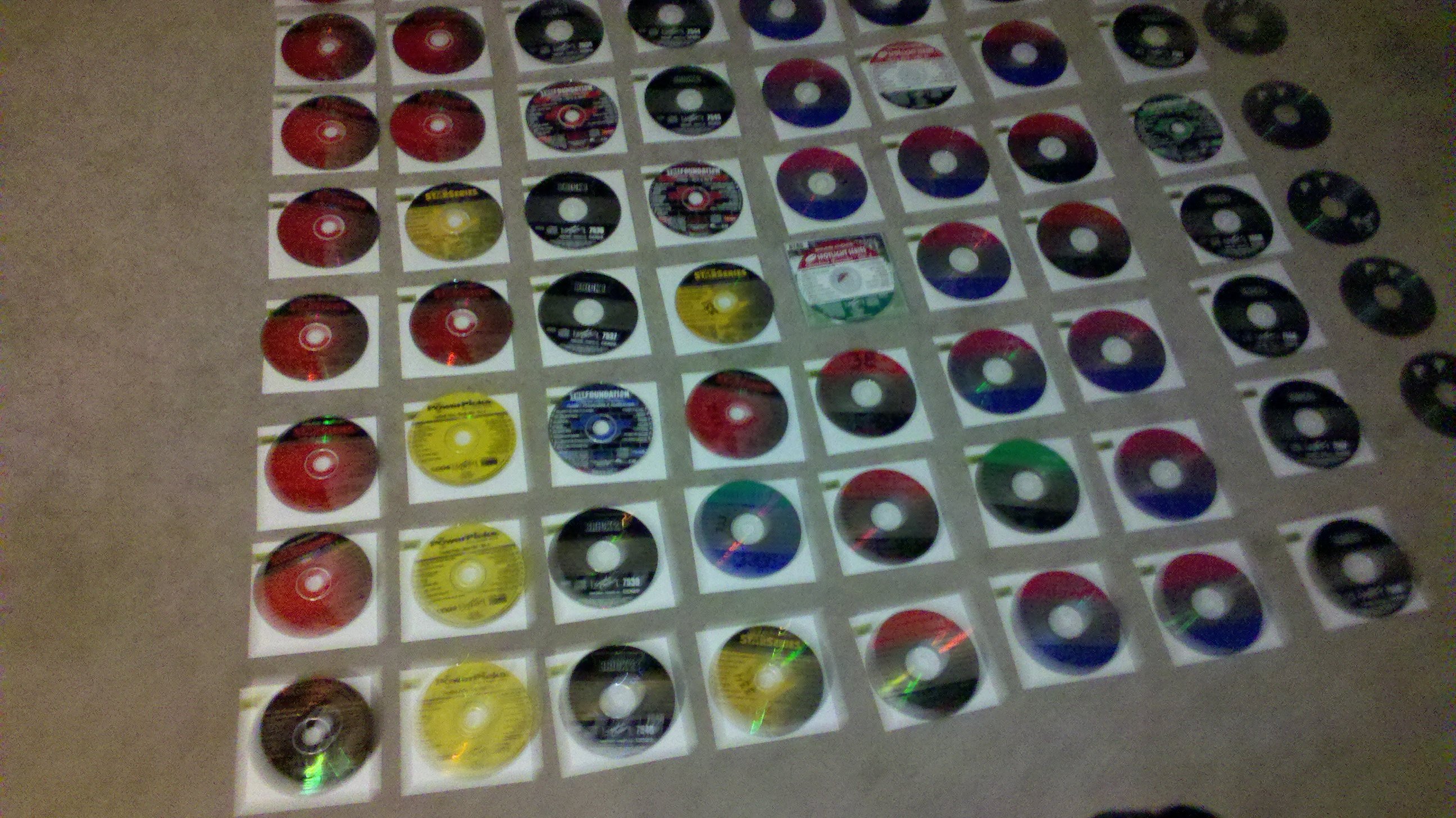 My library isn't huge by anymeans (approx 650+ discs and just over 10,000 tracks mostly CB), but considering I managed to put this together in little over a years time I'm pleased with it. The discs spread out are my SC's. The far right row is my SC Party Pack 2. Attachment: