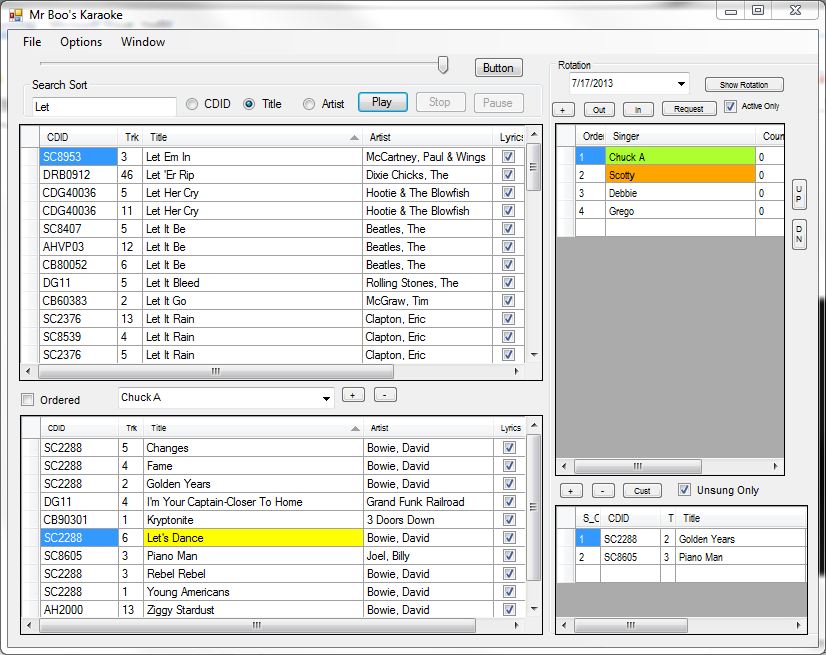 I just looked at Compuhost and, man, that's a busy screen. And you can't even search songs on the main screen? I am sure it works great if that is what you are used to. I'm gonna try to upload a screen shot of my main screen and the Player 1 screen. They are separate in my application. Upper left section is main song search. Lower left section is Playlist\Singer History. As text is typed the main song area is queried. The history works as a find, meaning the songs in a singers history doesn't shrink, it simply highlights the first song matching the criteria. ALL fields are highlighted in the playlist\history area that match the search criteria. The upper area on the right is the rotation. Notice the green and orange highlight. That means Chuck is the next singer. Once his song is played, the next singer is selected and is highlighted in green. The on deck singer is orange. The lower right section is the selected singers queue. Songs do not have to be played in order but the first song in the list is "tagged" if another song isn't selected.