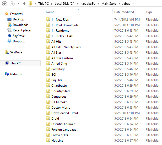 -Chris Thanks much.. I have a question for all of you... I currently have all my K-trax in a single folder. I also name them with a serial number instead of some of the newer naming conventions. How is you karaoke tracks folder(s) laid out and could I rely on retrieving the tag information to fill in the database on an import? Or would I need to deal with folders for artists\albums then file names for titles? Or is it some of both? I use the file names to determine how they get listed in my books as well as in my karaoke software. I have been using the somewhat standard format of - DiskID - Artist - TitleI DO NOT use ID3 Tags. Here is how I have my directory structure setup - I arrange first by manufacturer - Attachment: