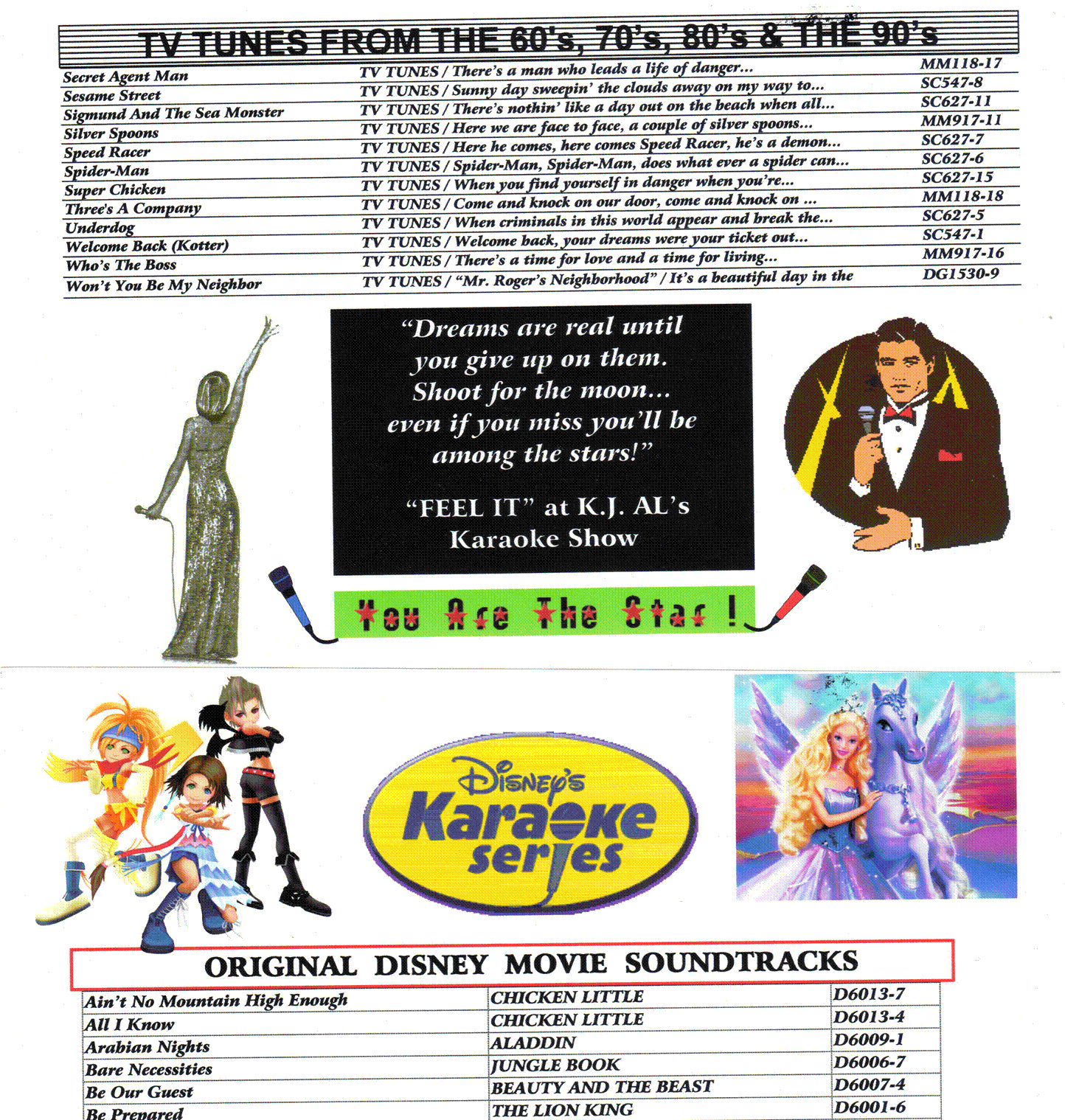 I’ve been using karaoke book artwork too for years. Well, it’s so nice to be retired!!! Meaning I got the Styx in me: “too much time on my hands”. No additional pages added from the graphic inserts. They’re added to fill the blank spaces. I think it looks better with, than without. I cut & paste the pages to make room for posting. I have 2 more pages with graphics but I think you got the idea about utilizing blank spaces. I also did the singer’s pics years ago, & the pages just keep on adding. (“Hey, I don’t see my picture there”! “Me too!”). So I decided to post their pictures @ the venue’s hallway.  Attachment: