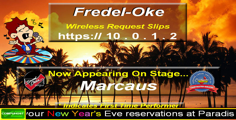 I use this for my queue when to go back to the stage when i'm out visiting with singers. so im always up on stage when the music is close to ending. no accidental dead air! Yes, the countdown timer. Great feature. Just wanted to point out that the screen shot is from version 1. The scroll and timer button is fancier in version 2. And don't forget, you can customize the scroll. Use different colors, also use the scroll to advertise your bars drink/food specials, etc. It does it all. That's the POWER of CompuHost. Here's a screen shot of version two, advertising New Years: