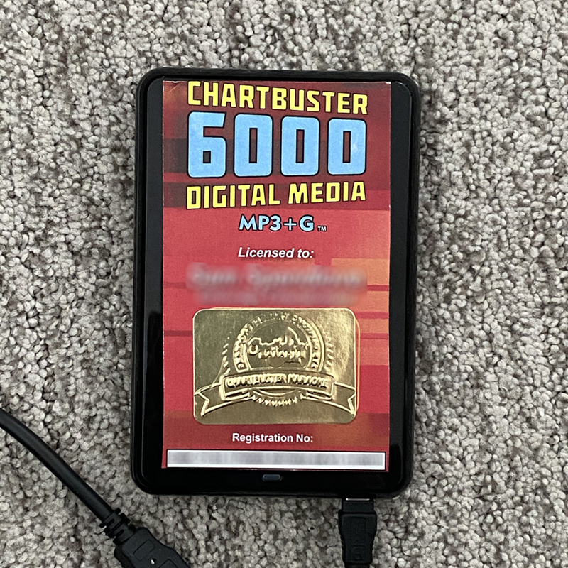 -SoundChoice Original GEM Series (100 discs, 3000 songs) -SoundChoice Saphire GEM Series (60 discs, 1800 songs) -SoundChoice Emerald GEM Series (40 discs, 1200 songs) -Chartbuster Hard Drive (I bought it directly from Chartbuster, it has a certification seal on it to show that it's legal) 6000 songs -Chartbuster 2010 Country Hits memory card with 50 MP3+G files -SoundChoice, all sealed CDGs: 43 Power Picks series (with 8 songs per disc), 3 Star Series (8 songs per disc), 12 Performer's Choice series (6 songs per disc), and 3 Spotlight Series (15 songs per disc) -The Singing Machine: 35 sealed discs with 4 to 9 songs per disc -Top Hits Monthly with 3231 songs: 71 sealed monthly discs (with 9 songs per disk), 8 sealed Value Pack yearly disks with 324 songs per disc