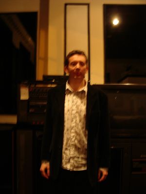 File comment: I didn't turn the flash on my camera so you can't really see but here is me standing in front of the laserdisc machine. There were dual disk changers either side at the bottom with the mixer/amp/changer control on top on one side and the TV on the other.